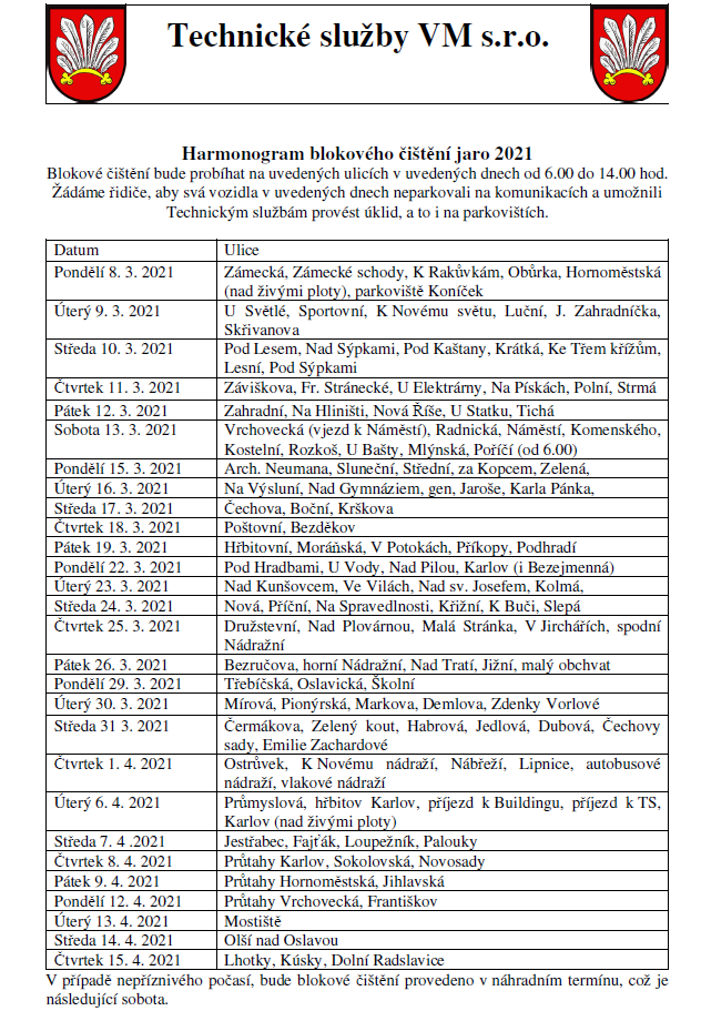 Blokové čištění města se nepatrně posouvá. Technické služby města Velké Meziříčí informovaly, že vlivem klimatických podmínek o týden posunou úklid ulic v centru. To znamená, že ulice, které měli pracovníci po zimě čistit v sobotu 6. března uklidí až následující sobotu 13. března. Ostatní dny v harmonogramu zůstávají neměnné.