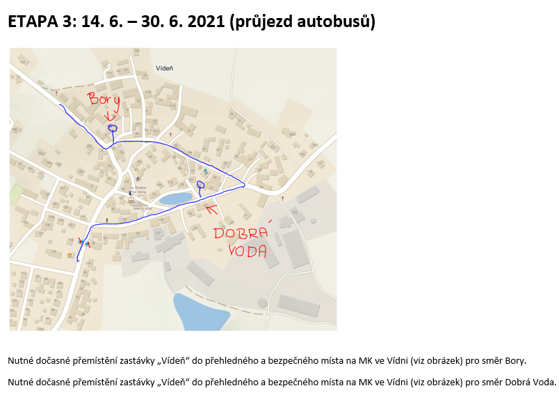 Budování nové kanalizace v obci Vídeň přináší dopravní komplikace. V termínu od 14. do 30. června nechá zhotovitel autobusy obcí projíždět. Dojde pouze k přesunu autobusových zastávek na bezpečnější a přehlednější místa. Ve směru do Borů a pro směr Dobrá Voda budou zastávky odlišné.