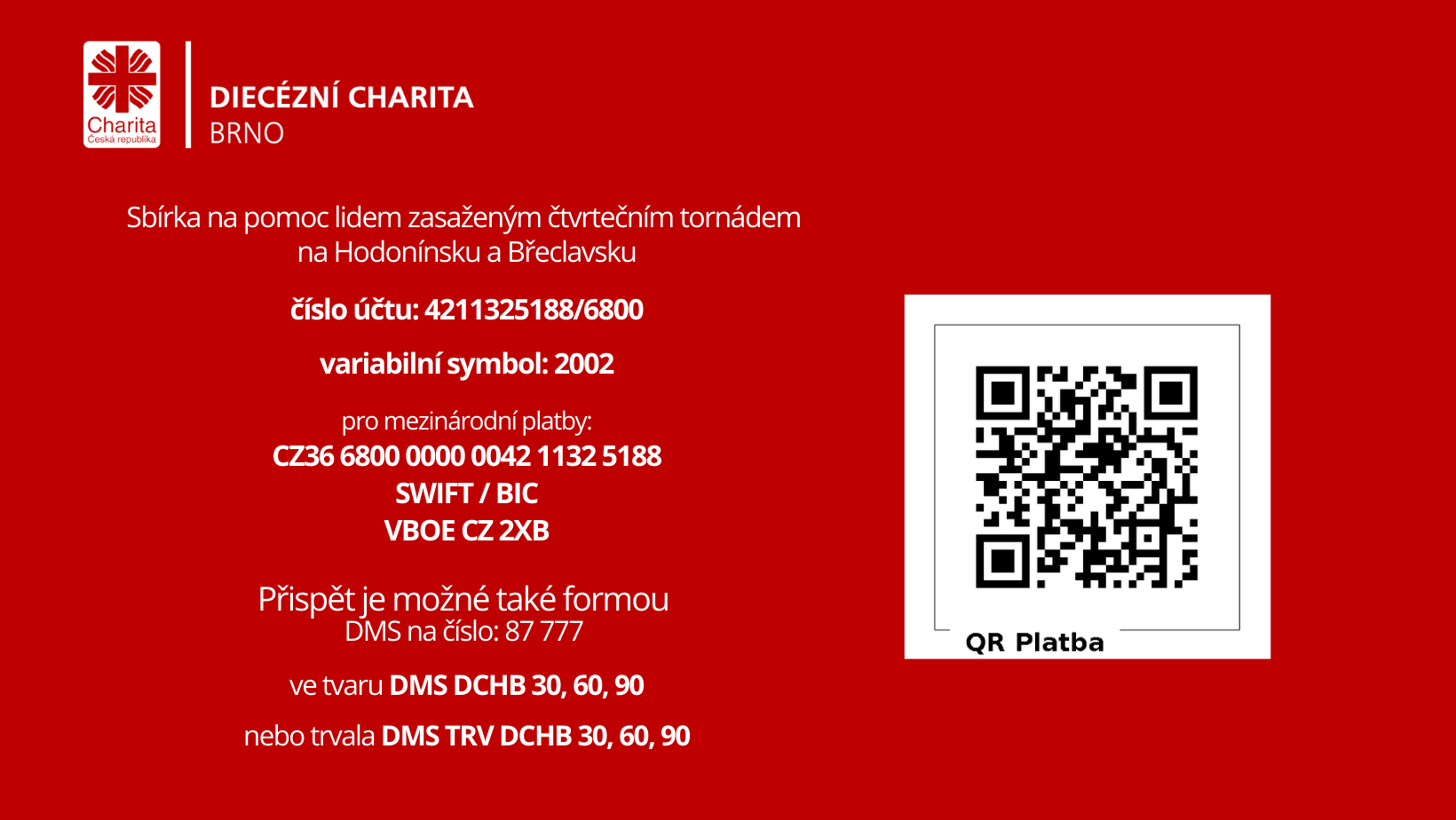 Diecézní charita Brno, která zaštiťuje i Oblastní charitu Žďár nad Sázavou, vyhlašuje sbírku na pomoc lidem zasaženým čtvrtečním tornádem na Hodonínsku a Břeclavsku.