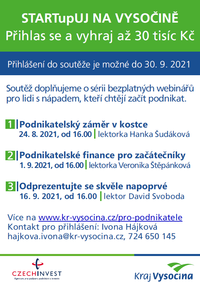 „Na přelom srpna a září připravil Kraj Vysočina sérii tří webinářů, které jsou určeny nejen začínajícím podnikatelům, ale i lidem s nápadem, kteří podnikání teprve zvažují. Hlavními tématy tvorby businessu provedou lektoři a odborníci se zkušenostmi z praxe, kteří se podpoře startupů věnují dlouhodobě. Přinesou nejen důležité informace k zahájení podnikání, jeho financování nebo prezentaci, ale také spoustu zajímavých tipů a doporučení na zlepšení. Získané informace navíc mohou účastnici webinářů uplatnit v rámci soutěže CzechInvestu STARTupUJ NA VYSOČINĚ, kde je Kraj Vysočina partnerem," informuje náměstkyně hejtmana pro oblast regionálního rozvoje Hana Hajnová. Webináře pro začínající podnikatele jsou bezplatné.