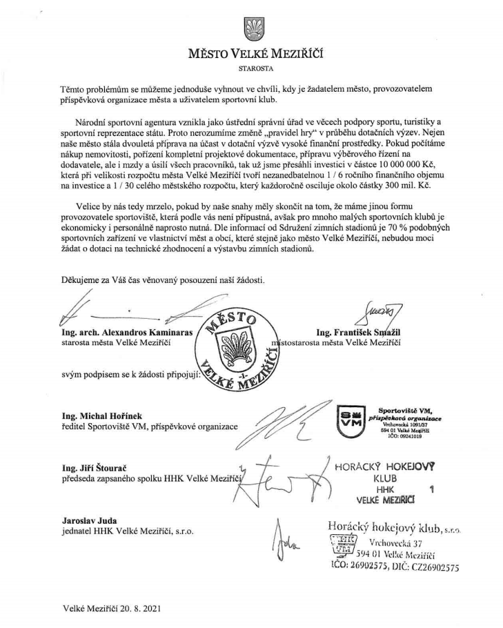V otevřené žádosti předsedovi Národní sportovní agentury, Filipu Neusserovi, žádá starosta a místostarosta města ve spolupráci s ředitelem příspěvkové organizace Sportoviště VM a představiteli Horáckého hokejového klubu Velké Meziříčí o úpravu podmínek nové dotační výzvy. Oproti té stávající by nově upravená výzva měla umožňovat městům a obcím, aby se stali žadateli i v případě, kdy sportovní zařízení vlastní a dlouhodobě pronajímají nebo dávají do výpůjčky nejen sportovnímu klubu, ale také příspěvkové organizaci města či obce, která tato sportoviště provozuje.