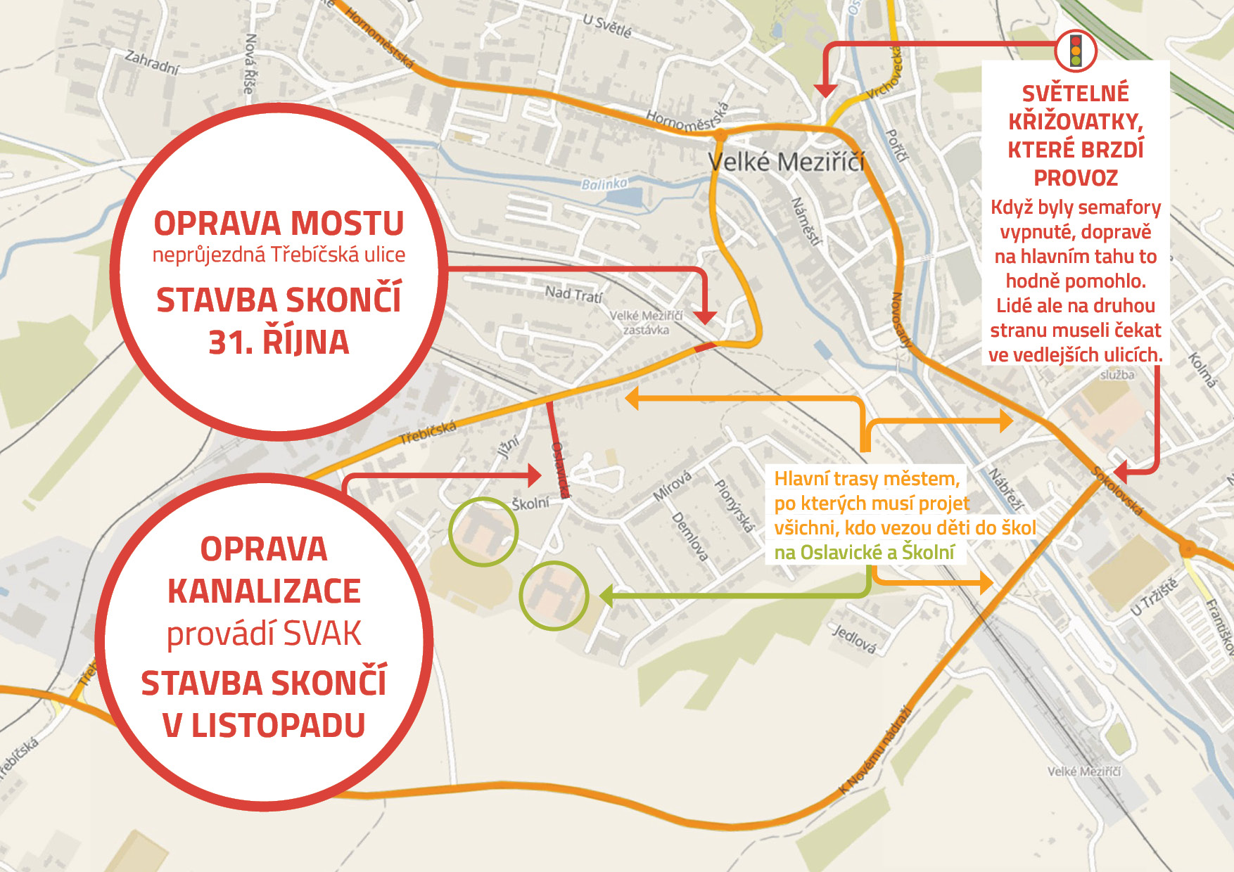 Dopravní problémy mají dvě základní příčiny. Sešla se totiž velká oprava mostu na Třebíčské s opravou kanalizace na Oslavické a konec prázdnin, lépe řečeno – začátek školního roku. Druhou příčinou je pak fakt, se kterým nikdo nic neudělá – Velké Meziříčí má pouze dva hlavní tahy: průjezd Praha – Brno a směr Třebíč. Pokud je jeden z těchto dvou tahů uzavřen, všichni musí po tom druhém.