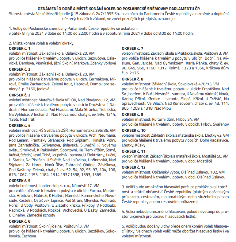 Od 8. října do 9. října 2021 se uskuteční volby do Poslanecké sněmovny České republiky. V pátek se volební místnosti otevřou ve 14 hodin a uzavřou ve 22 hodin. V sobotu bude možné odvolit v čase od 8 do 14 hodin.