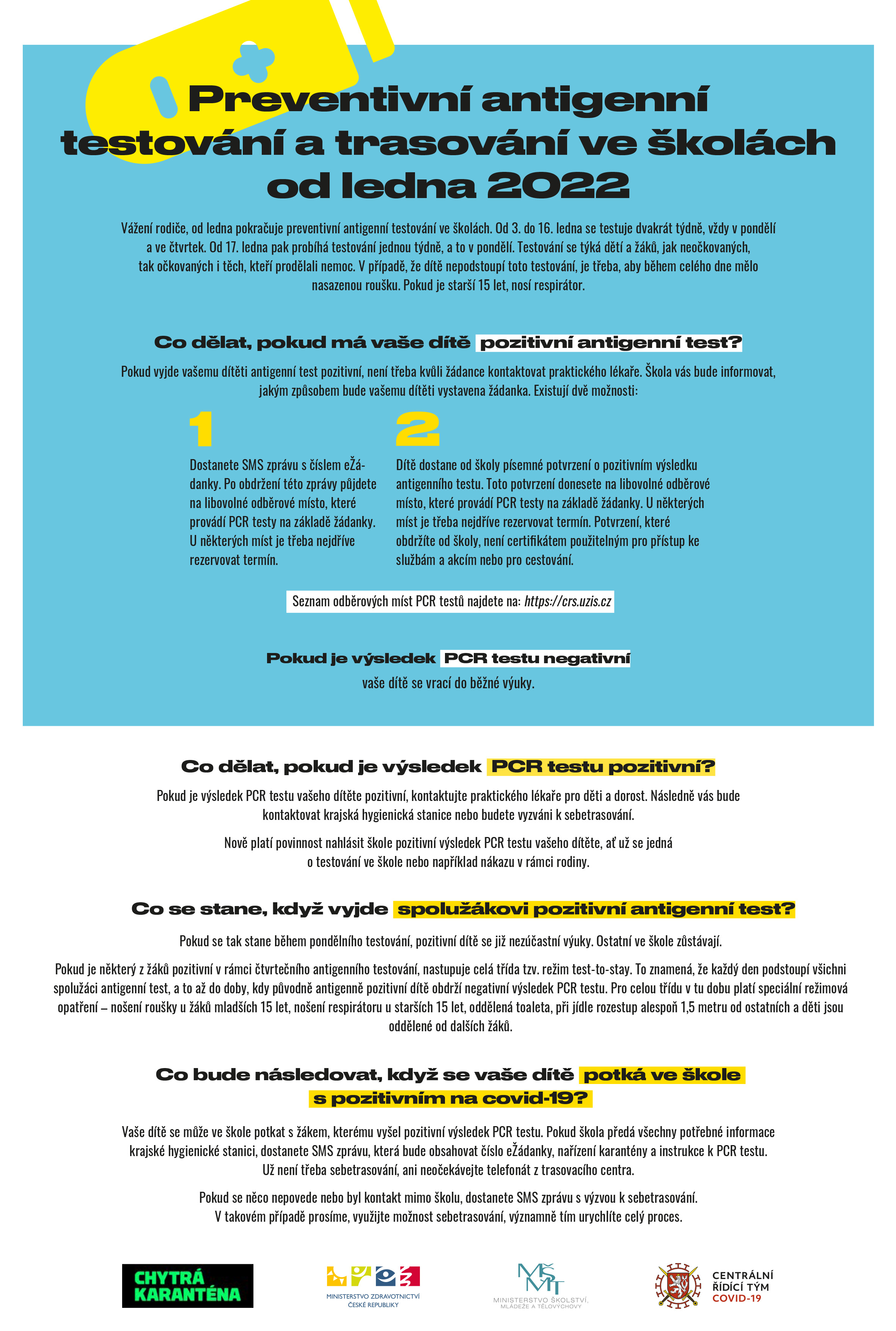 Od 3. do 16. ledna ve školách probíhá testování již dvakrát týdně, a to vždy v pondělí a ve čtvrtek. Od 17. ledna pak bude probíhat testování pouze jednou týdně, tedy v pondělí. Testování ve školách se týká žáků neočkovaných, očkovaných i těch, kteří nemoc prodělali. V případě, že žák testování nepodstoupí, bude nutné, aby měl během celého dne nasazenou roušku. Pokud je starší 15 let, musí mít namísto roušky respirátor.