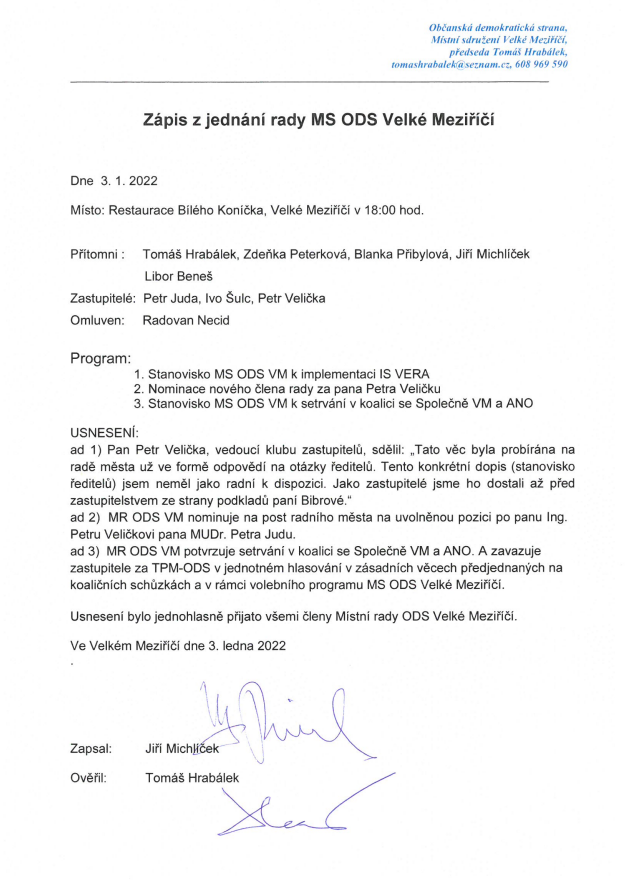 Usnesení bylo jednohlasně přijato všemi členy Místní rady ODS Velké Meziříčí.