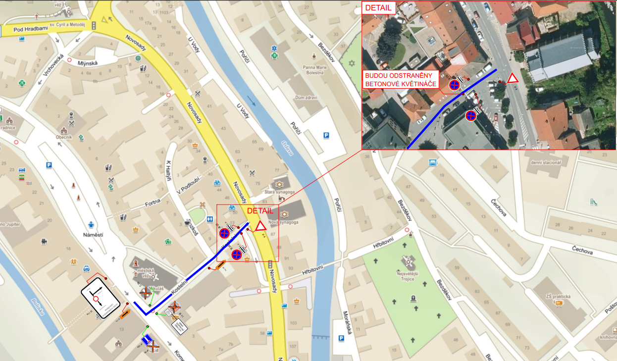 V sobotu 5. března dojde k úplné uzavírce ulice Komenského, a tím se znemožní výjezd z náměstí. Objízdná trasa povede přes ulici Kostelní směrem k synagoze, kde technické služby dočasně odstraní betonové květináče. Důvodem změny v dopravě je stavba kanalizační přípojky.
