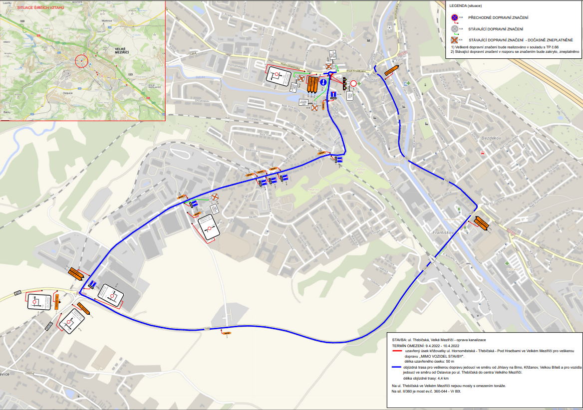 Řidiči jedoucí od Jihlavy na Brno budou muset využít objízdné trasy přes Třebíčskou ulici a po obchvatu zpět na hlavní silnici II/602, respektive na Sokolovskou ulici. Od 9. do 10. dubna se bude v části okružní křižovatky (Hornoměstská x Třebíčská x Pod Hradbami) opravovat kanalizace. Z opačného směru se průjezd kruhovým objezdem i během oprav zachová.